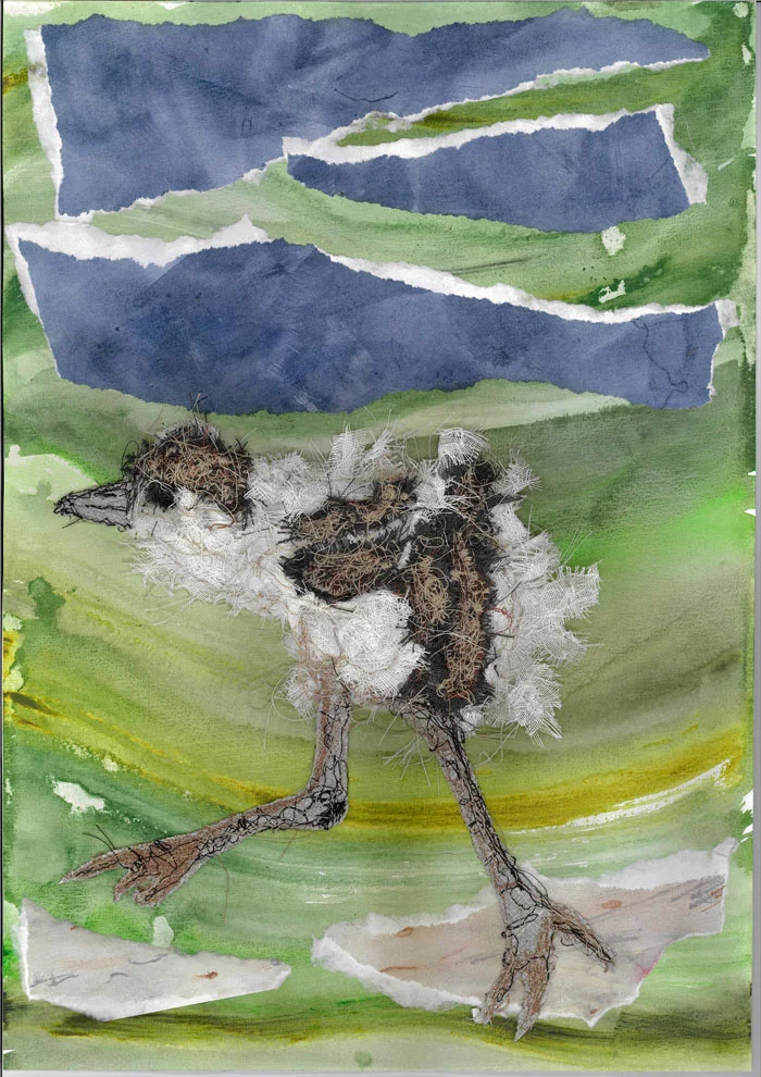 Sunday Young | Plover chick | 2024 | paper and reused curtain fabric, acrylic and watercolour pencils