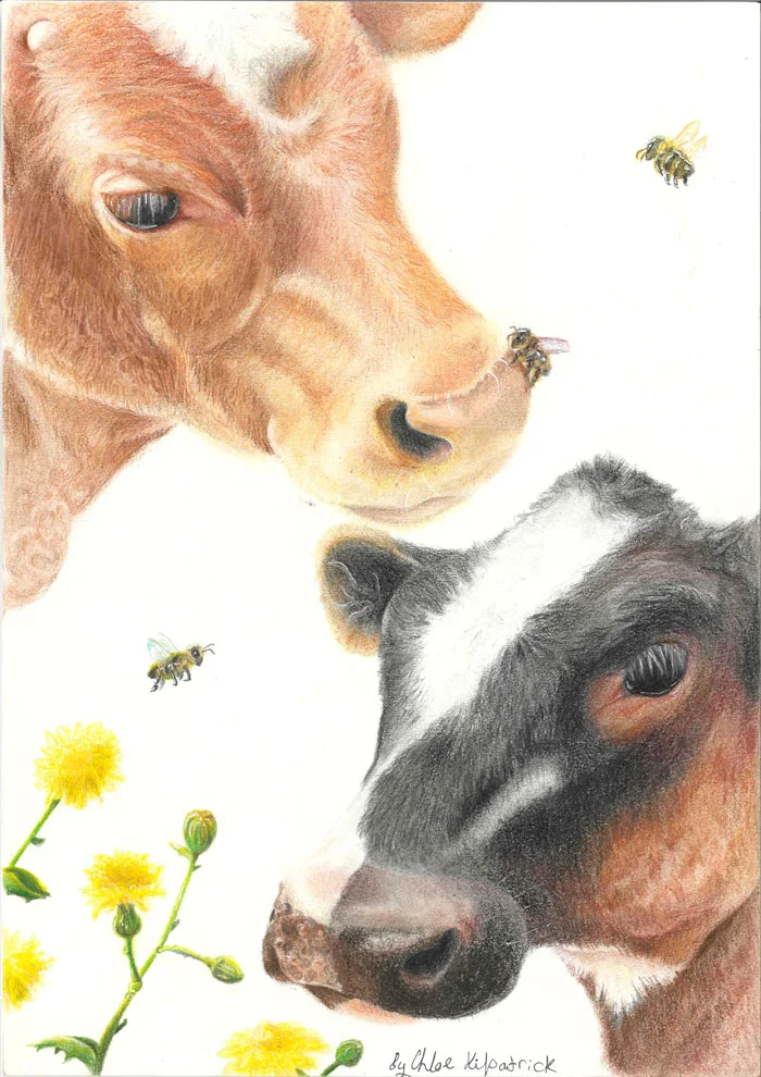 Chloe Kilpatrick | The Moo Moos and the bees | 2024 | coloured pencils on multimedia paper