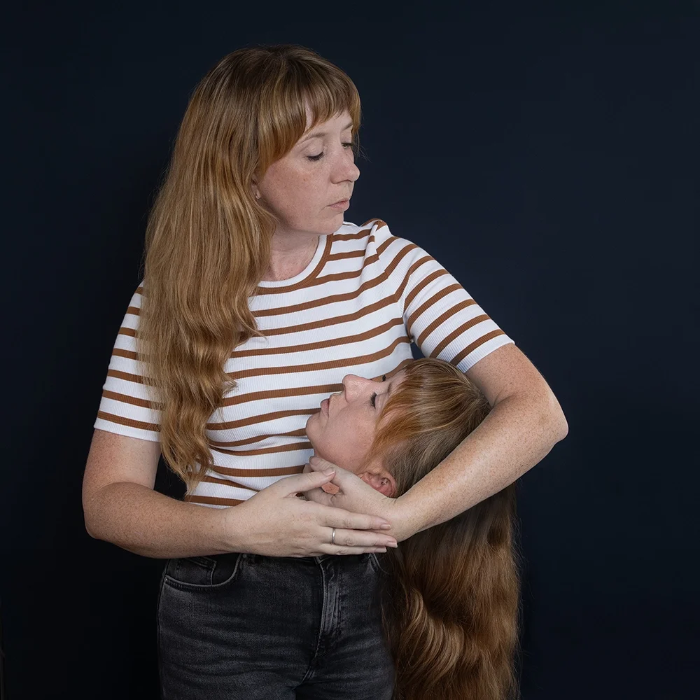 Self Soother, Action Two is part of an ongoing photographic series which plays with bodily actions that respond to immaterial spaces, centring on how psychological sites can be given physical presence and the relationships in such actions. As a neurodivergent artist, Portman examines these shifting psychological landscapes through the use of self-portraiture and notions of self-soothing behaviours, such as the cradling of a doppelgänger’s second head in her arms. The tenderness of which the head is held lends to a surreal quality as the figure tries to sooth the internal discomforts of shifting perceptions and outsider experiences.