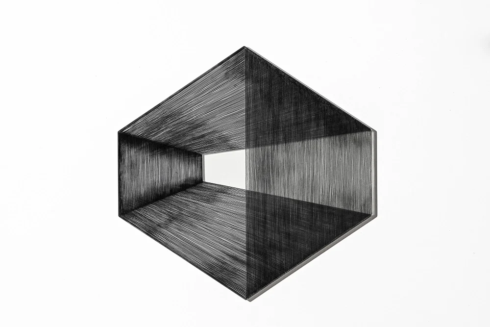 This work explores the optical illusion of depth and form through the interplay of surface, transparency, and light. Created by painting layers of fine, linear marks on both the front and rear faces of glass, the rectangular prism appears to project beyond its flat plane, shifting with the viewer’s perspective.