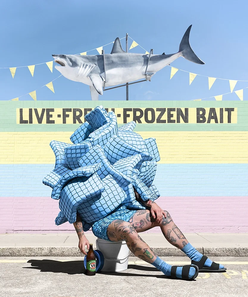 In this work Bait, I use costume and camera to conjure a world of Australian tropical kitsch – one not too far removed from the parochial torpor of Porpoise Spit, albeit queered and reimagined with warm nostalgia and knowing camp.
