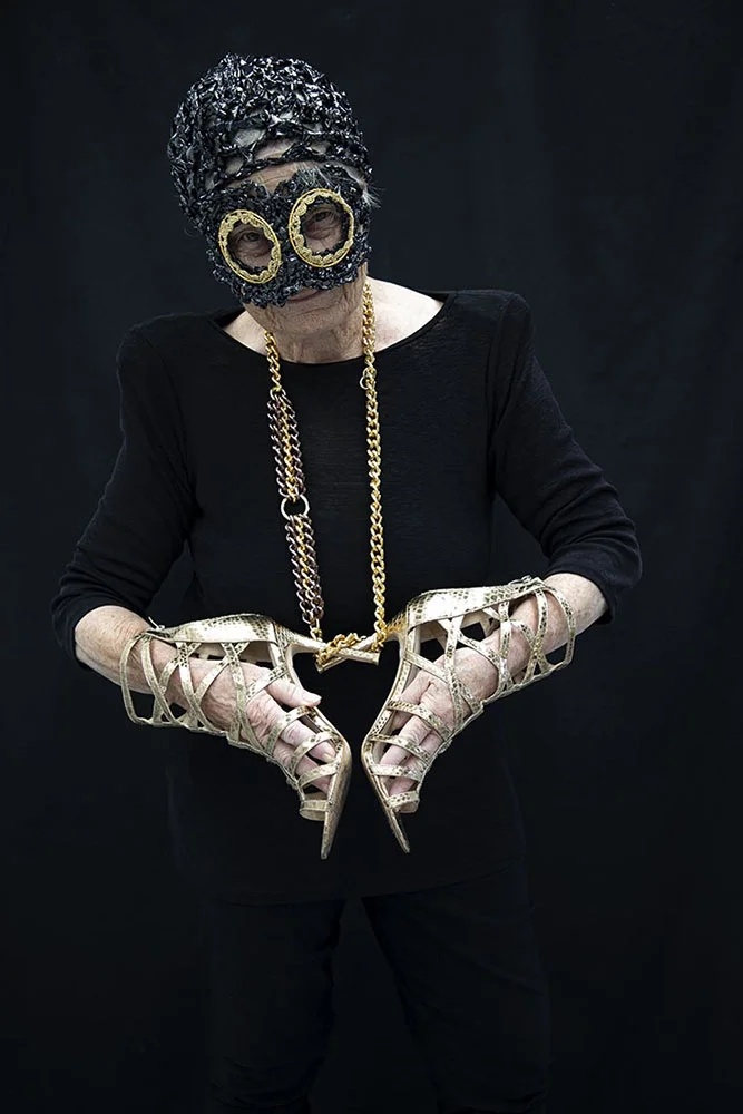 Defiance and nostalgia seep from the masked woman’s hands. Never mind that her feet - and freedom - have been sacrificed for f(fashion)’s sake.