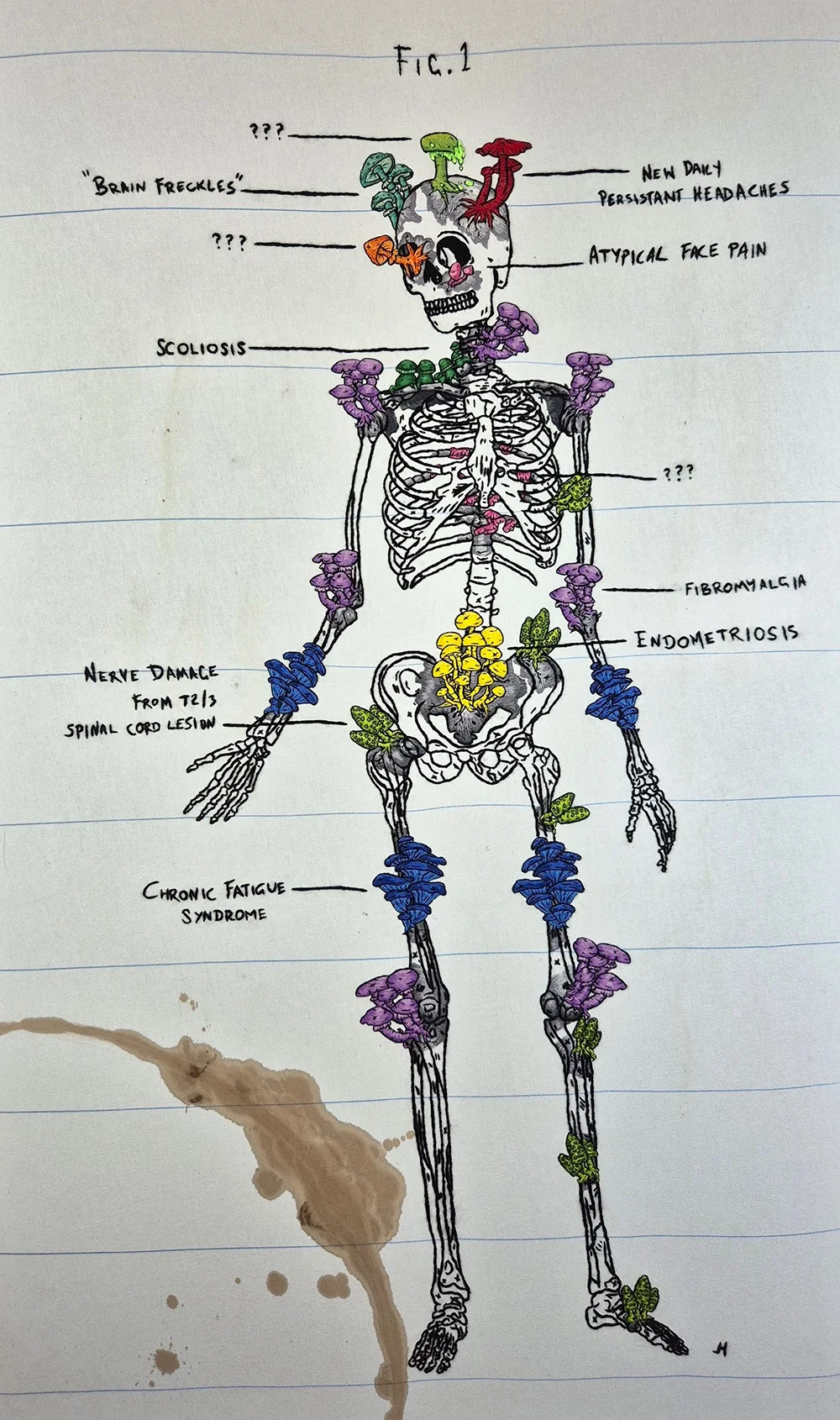 The skeleton was sized at half the height of the artist, as chronic illnesses and conditions often make you feel diminished and less of a person. The bold linework of the skeleton and text have been made to look almost unrefined and ‘hand drawn’, like careless pen strokes in a medical practitioner’s grimy, forgotten notebook. Each mushroom has been coloured in a limited colour palette to add to the illustrative nature of the piece. Occasionally, parts of a mushroom will appear at unexpected angles, in odd positions, or even be missing, representing the unpredictable nature of these illnesses.