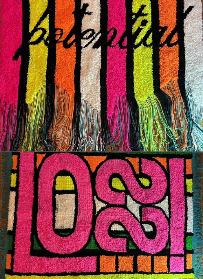This series of hand-hooked rugs, made with a Donella needle and up cycled wool, transforms familiar materials into visually tactile works that suggest touch through their crafted surface and embedded language.