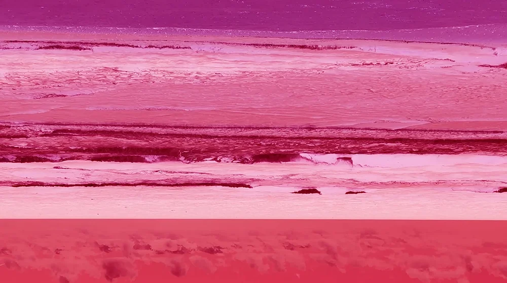 Mesmerising and other worldly, Inversion #5 challenges our perception of a beach landscape. The work inverts our view of a familiar scene and allows a reconsideration of time and space. I am interested in collapsing and expanding plane and perspective. My practice explores non-linear perception through spatial enquiry – remapping the spaces I inhabit and move through in my daily routine. Inversion #5 presents a meditative and embodied experience of location. The rhythmic movement of the ocean is bordered by stillness in blushing and disruptive colour.