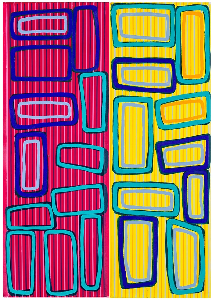 Walala Tjapaltjarri and Michael Eather have been working together for 25 years, often producing collaborative paintings and sculpture. Recently, with a suitcase full of his own vibrant and striped canvases, Eather travelled to Alice Springs. There, Tjapaltjarri reacted to these backgrounds, painting his Tingari forms, which are distinct interpretations of Pintupi ceremonial men’s designs. For over 30 years, Walala has been developing his own unique take on classic Tingari designs. He chooses his own colours, constructing spontaneous arrangements of Tingari that contrast Eather’s linear backgrounds. Sometimes they clash. Sometimes they harmonize. The resulting forms are minimalist and bold; metaphysical landscapes that bring ancient symbols to the here and now. Walala and Michael’s collaborative process reflects a dynamic relationship between artists and friends.