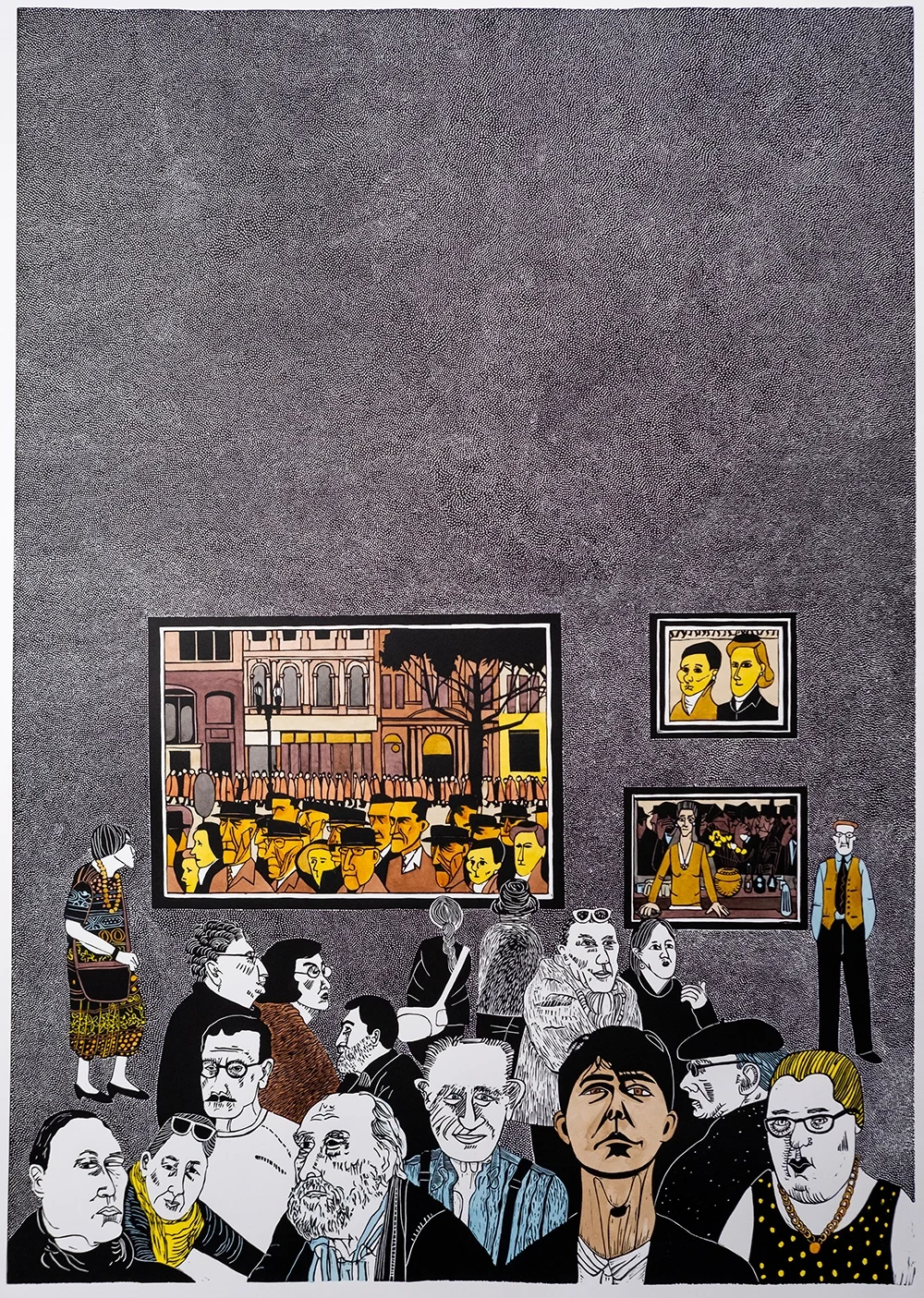 This hand-coloured lino print is part of an ongoing series concerned with paying homage to iconic works of art. A group of people views paintings in an imaginary art museum of my making.